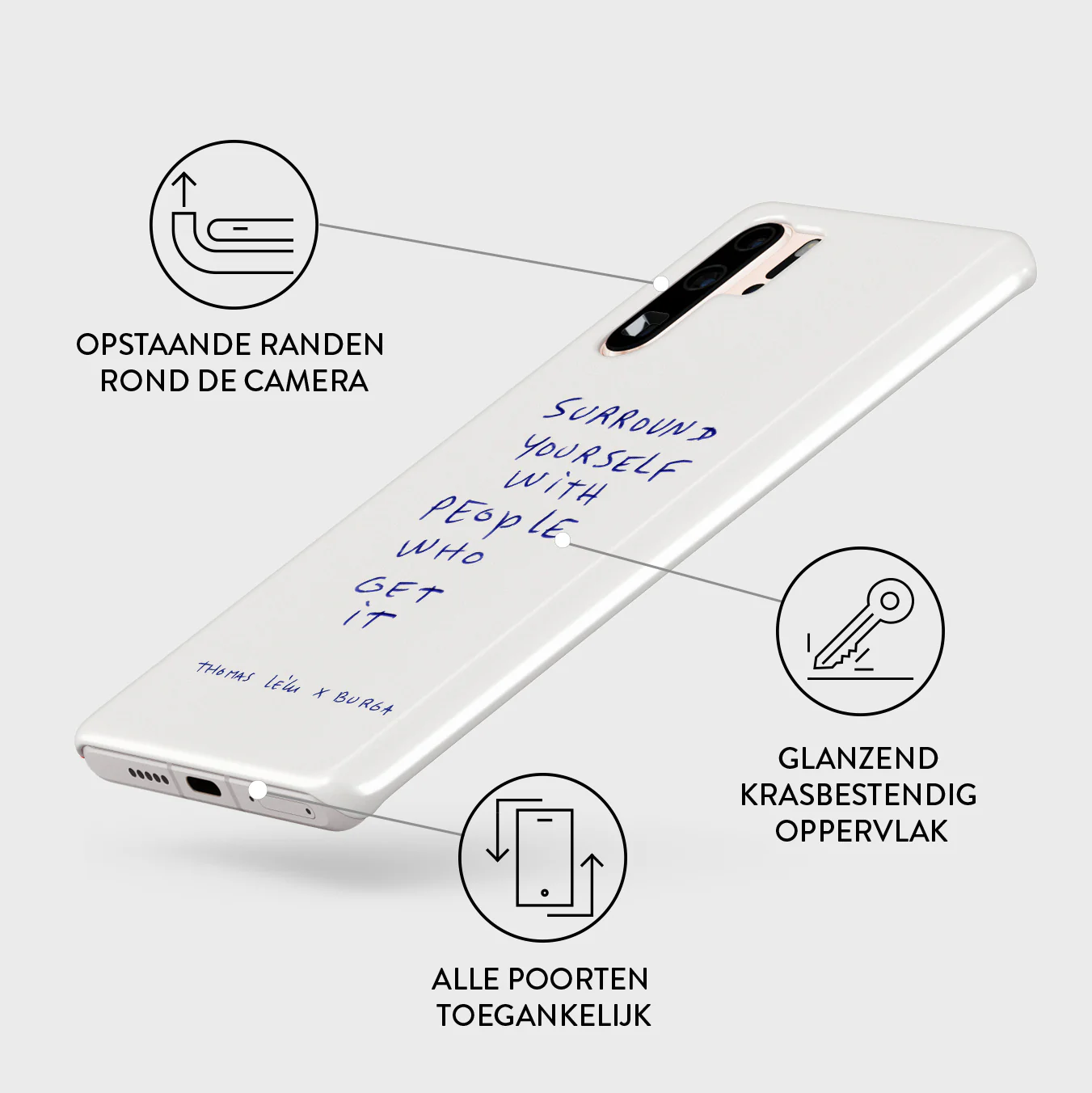- Verhoogde randen rond de camera voor extra bescherming.