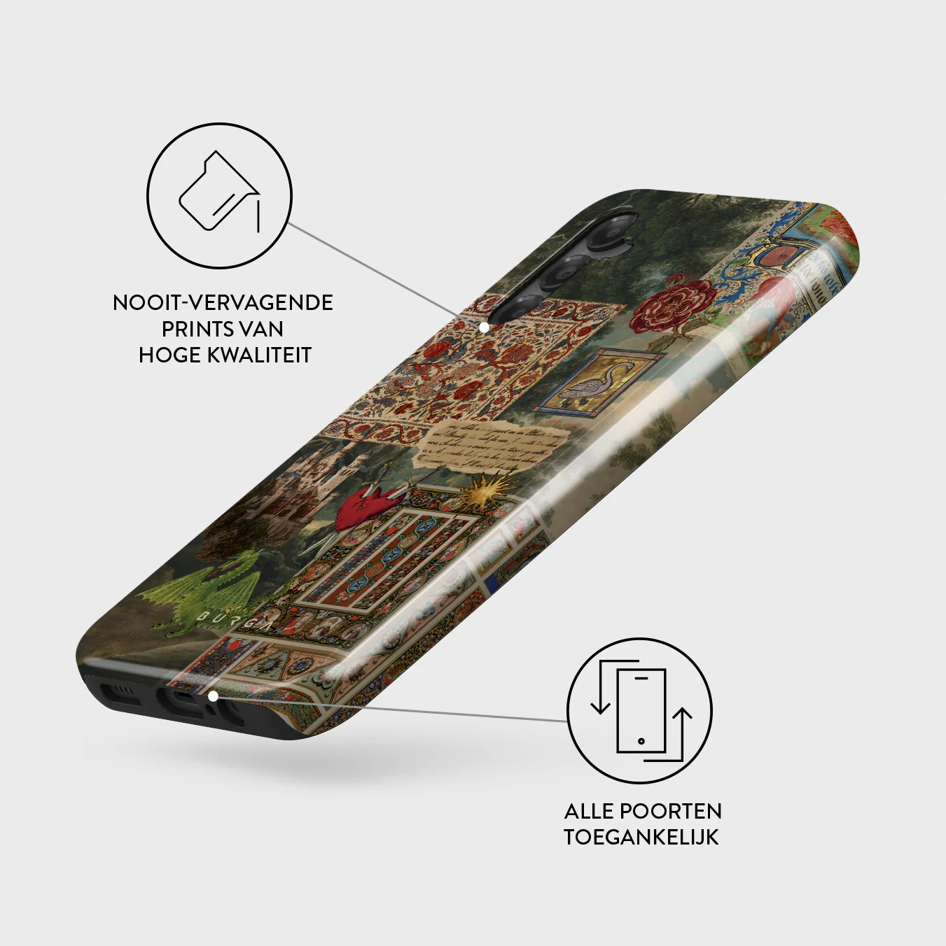 Kenmerken van dit design: handgeschreven kalligrafisch lettertype, vintage print, middeleeuws design, bloemenpatroon, oude boekillustraties, hart, draak, kasteel