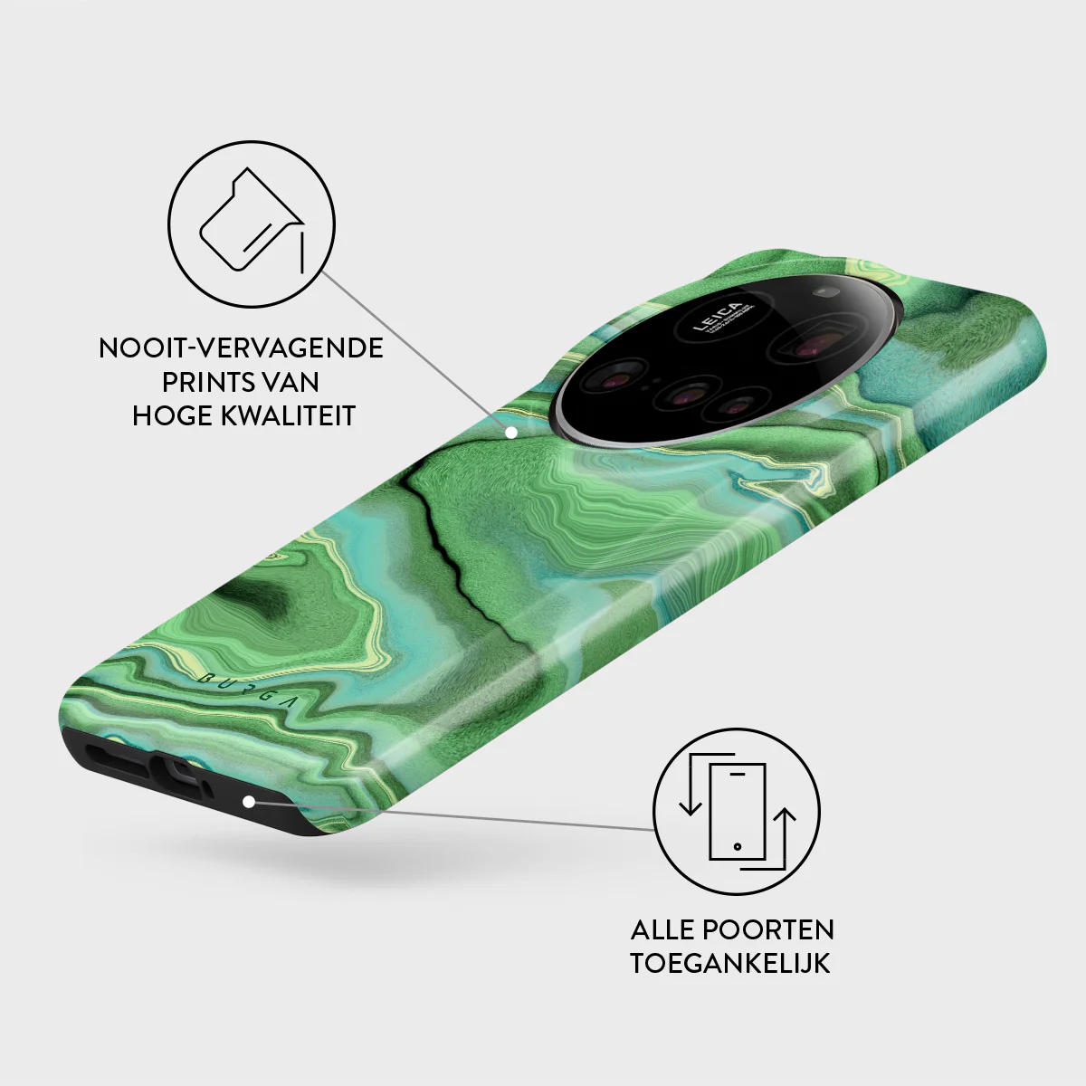 - Verhoogde randen rond de camera voor extra bescherming.