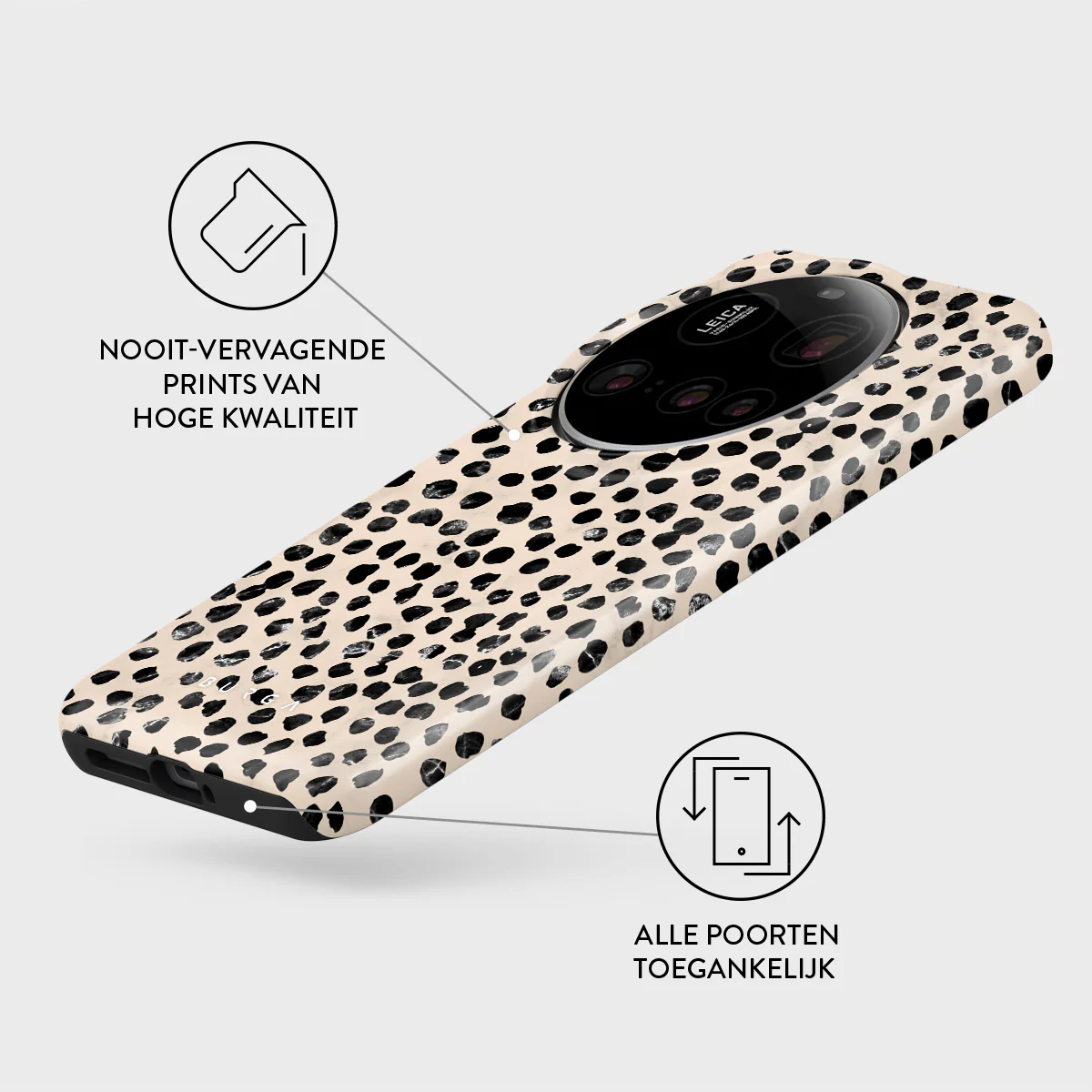 - Verhoogde randen rond de camera voor extra bescherming.