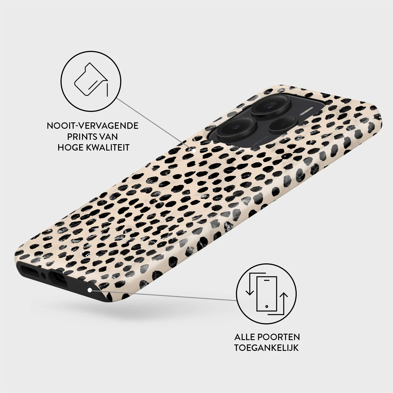 - Verhoogde randen rond de camera voor extra bescherming.