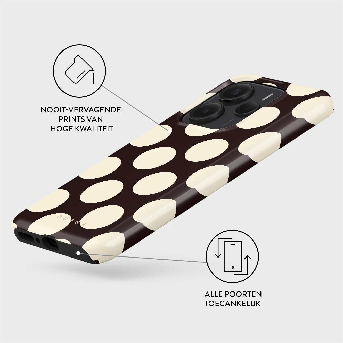- Verhoogde randen rond de camera voor extra bescherming.