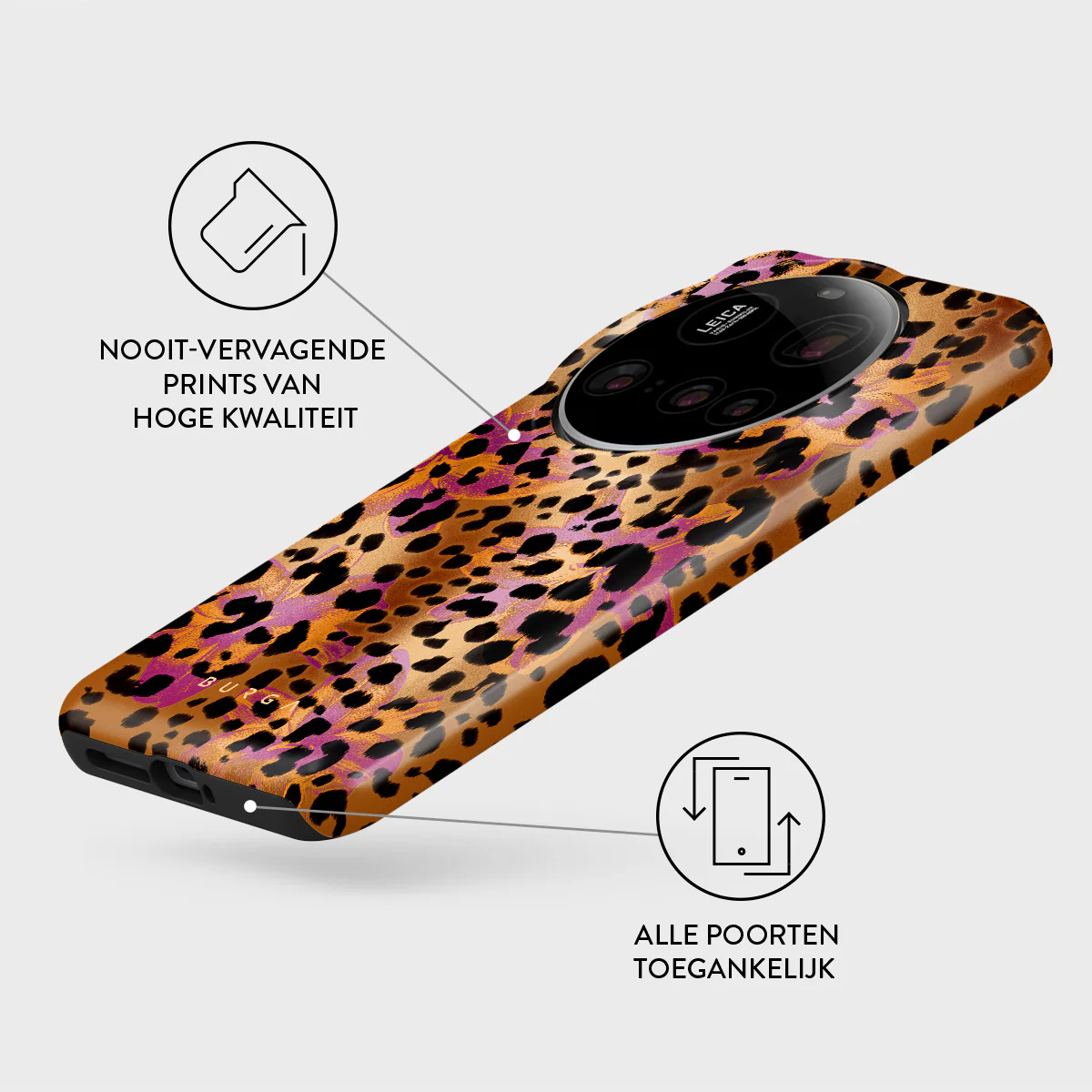 Kenmerken van dit design: luipaardprint, bruin, oranje, paars, dierenprint.
